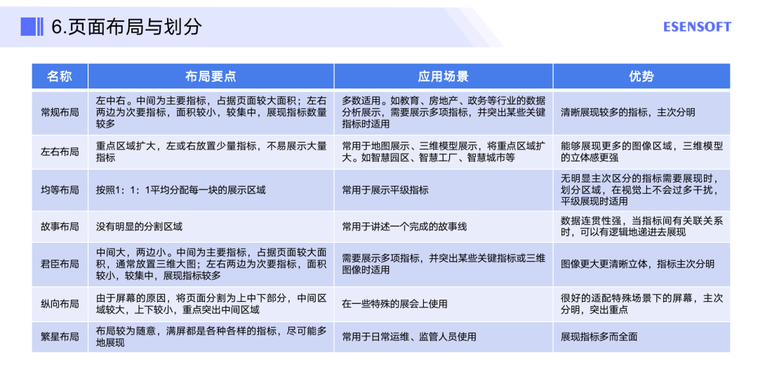 这里我们列举了一些7种页面布局的要点,应用场景和优势,大家可以看看,下面我们分别来给大家展示下:
