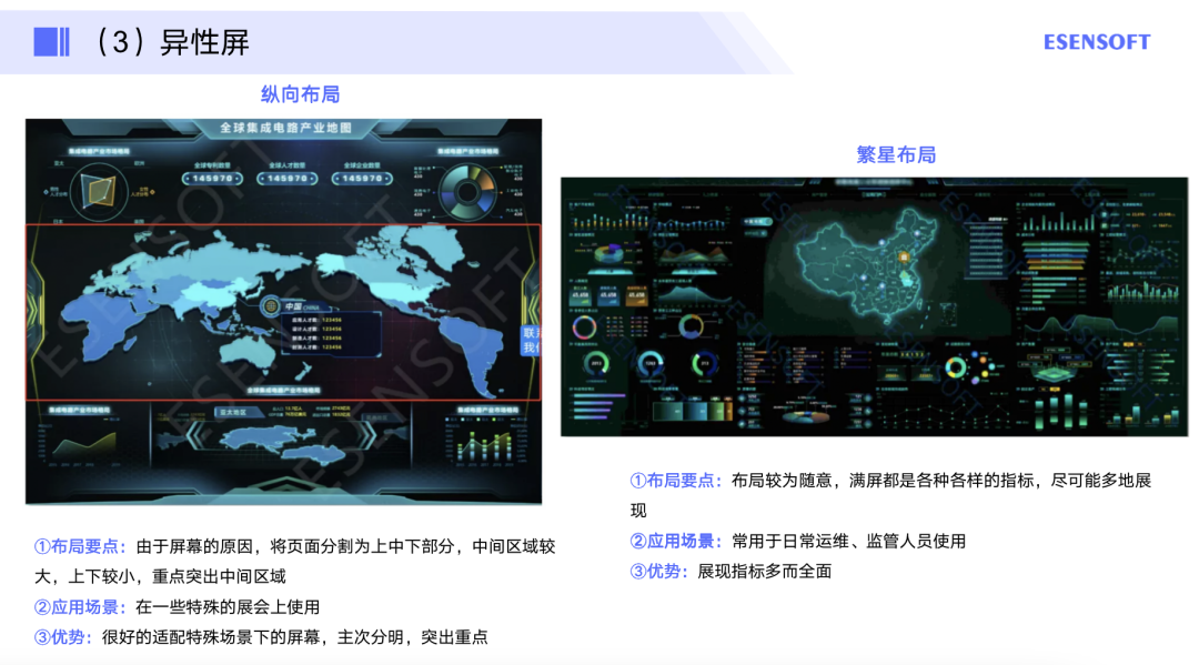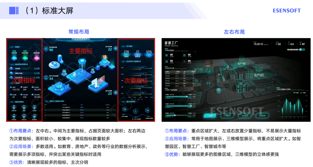常规布局就是中间为主要指标,左右两边次要指标,经常用在教育、房地产、政务等行业的数据分析展示中;左右布局就是重点区域扩大,左或右放置少量指标,经常用在智慧园区、智慧工厂、智慧城市等。