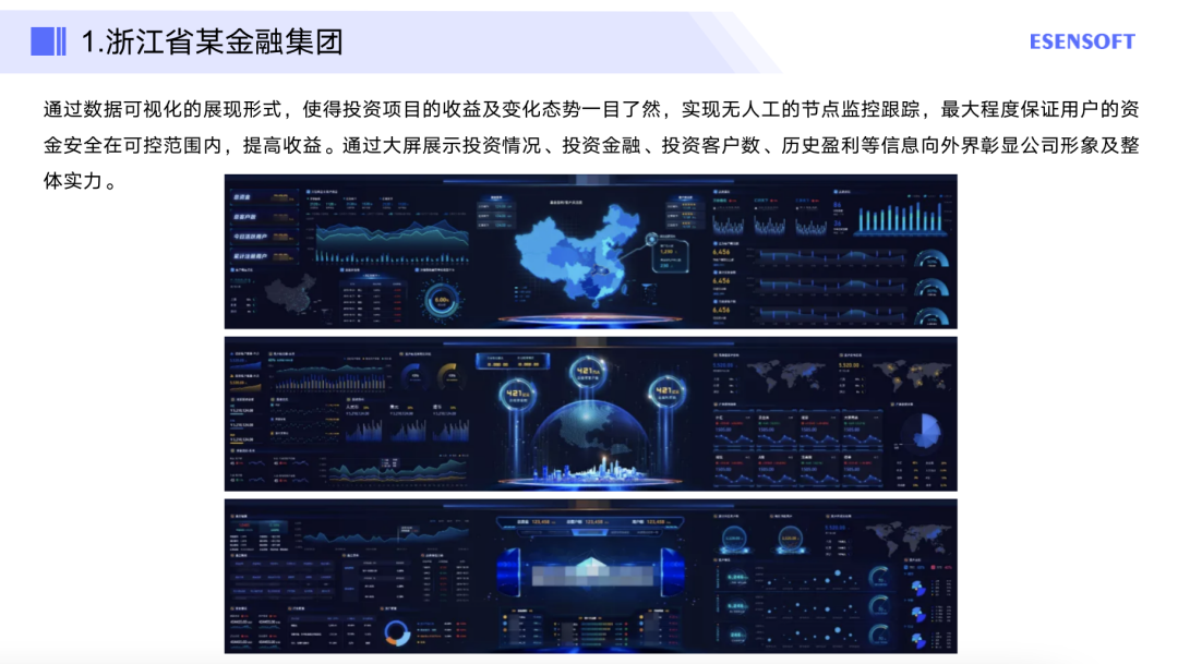 通过大屏展示投资情况、投资金融、投资客户数、历史盈利等信息向外界彰显公司形象及整体实力。