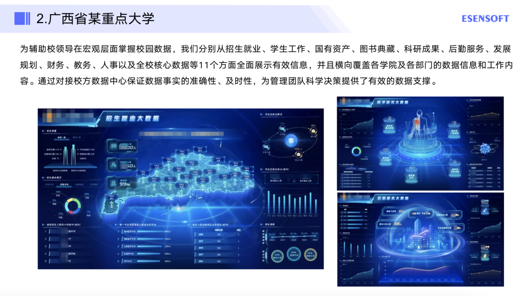 为辅助校领导在宏观层面掌握校园数据,亿信华辰分别从招生就业、学生工作、国有资产、图书典藏、科研成果、后勤服务、发展规划、财务、教务、人事以及全校核心数据等11个方面全面展示有效信息,并且横向覆盖各学院及各部门的数据信息和工作内容。