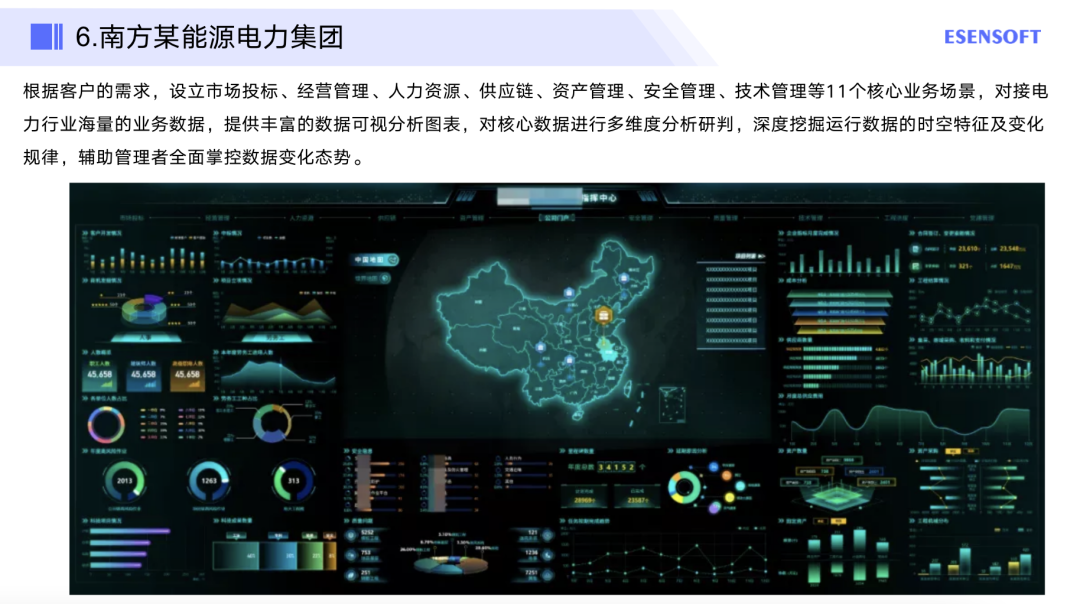 亿信华辰根据客户的需求,设立市场投标、经营管理、人力资源、供应链、资产管理、安全管理、技术管理等11个核心业务场景,对接电力行业海量的业务数据,提供丰富的数据可视分析图表,对核心数据进行多维度分析研判,深度挖掘运行数据的时空特征及变化规律,辅助管理者全面掌控数据变化态势。