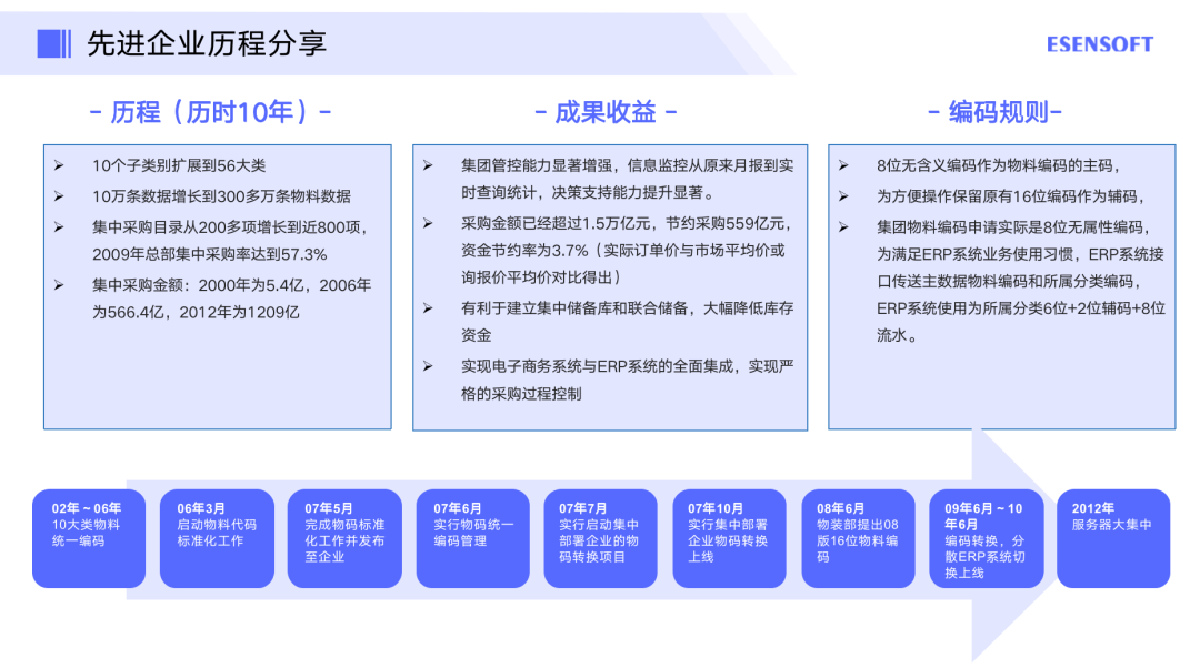 接下来,我们分享一个先进企业的主数据建设历程。如图所示,这是一家石油企业前后花了10年时间做的物料主数据管理,从最开始的10个子类扩展到最后的56个大类,数据也从10万条增加到300万条,这样庞大的数据如果要做一些精细化管理肯定是比较有难度的。