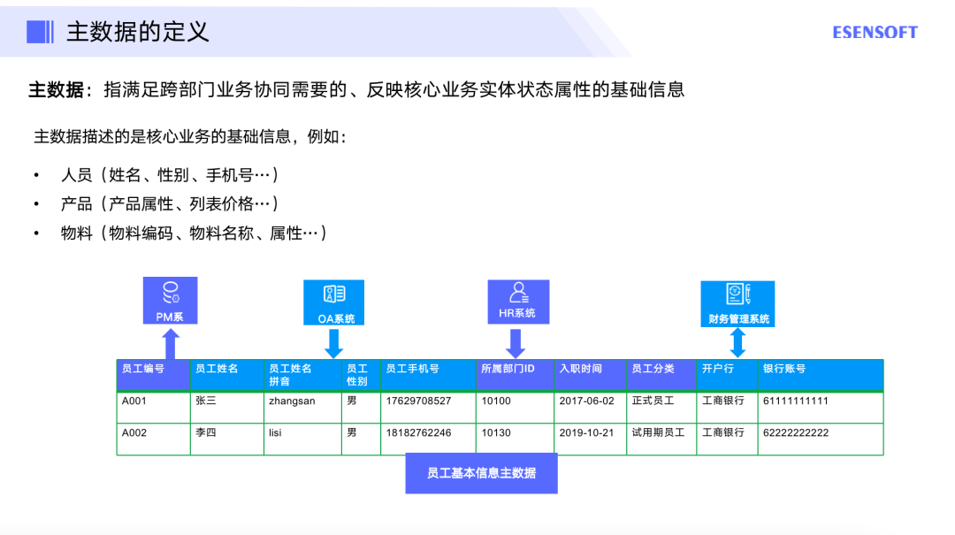 主数据是指满足跨部门业务协同需要的,反映核心业务实体状态属性的基础信息。举个例子,公司的员工信息,存在于很多业务系统里,比如人力系统、财务系统、OA系统,以及考勤系统等,但每个系统所需要的信息可能不一样,财务系统需要员工开放信息,比如从哪个银行开户,账号是什么,这样方便打款;人力系统可能只是需要员工的一些入职信息。