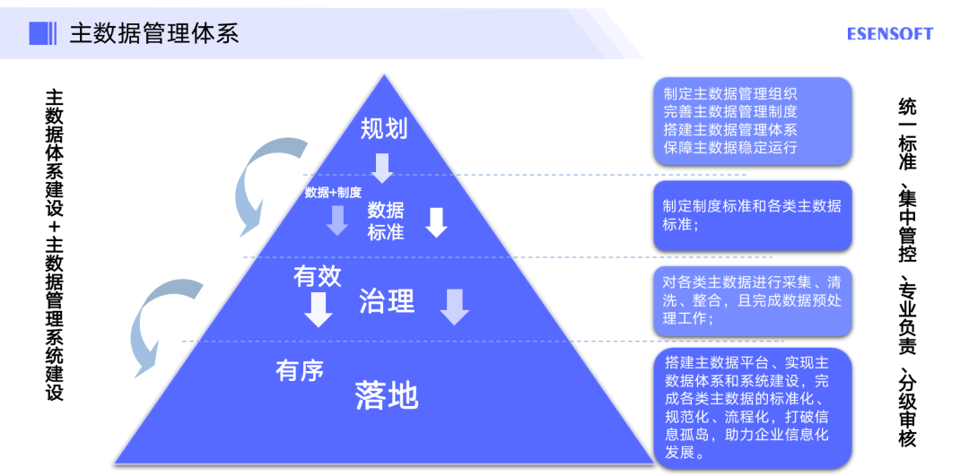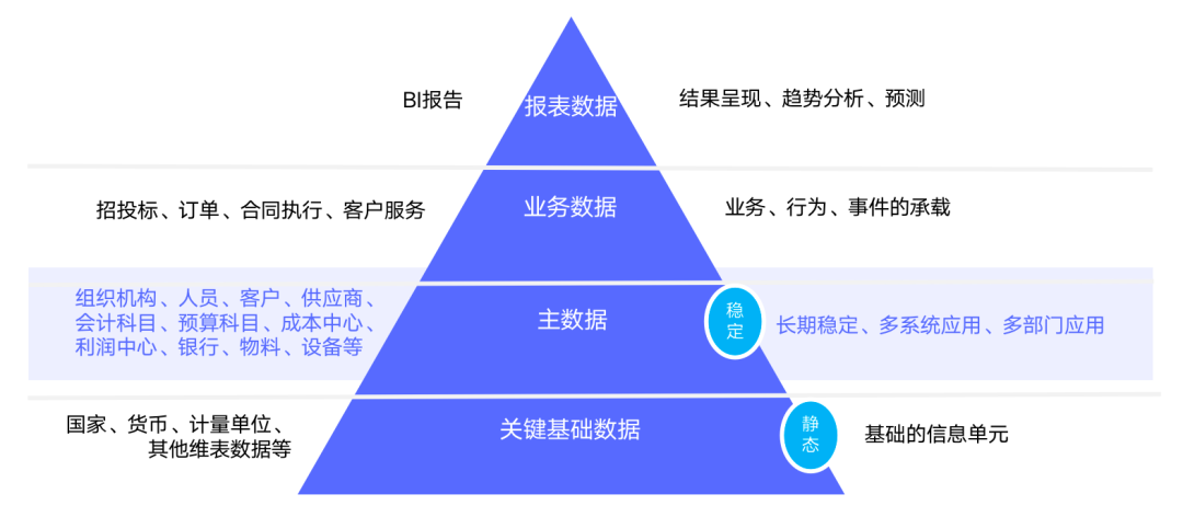 一家企业不只有主数据,还有一些其他数据,这里有一个金字塔结构的企业数据模型,包括关键的基础数据、主数据、业务数据、报表数据。
