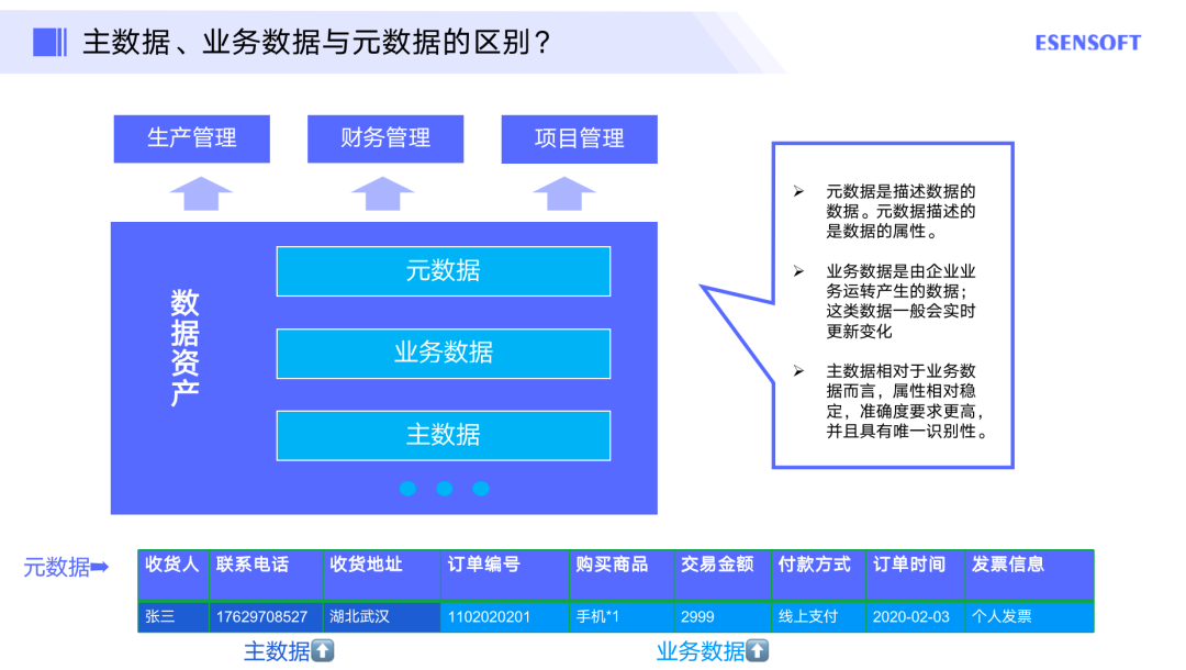 如图所示,表头就是元数据,这些字段本身描述了字段的一些属性信息;而主数据其实就是这样的一条记录,这条记录可以划分为两部分,一部分是主数据,描述核心业务实体属性的数据,另外一部分就是主数据在业务交易过程中由系统产生的数据,比如这块的订单数据就是业务数据。总的来说,所有这些数据作为企业的一部分,只要能产生价值,它都可以称之为数据资产,能去支撑企业上层的生产、财务、项目管理等。