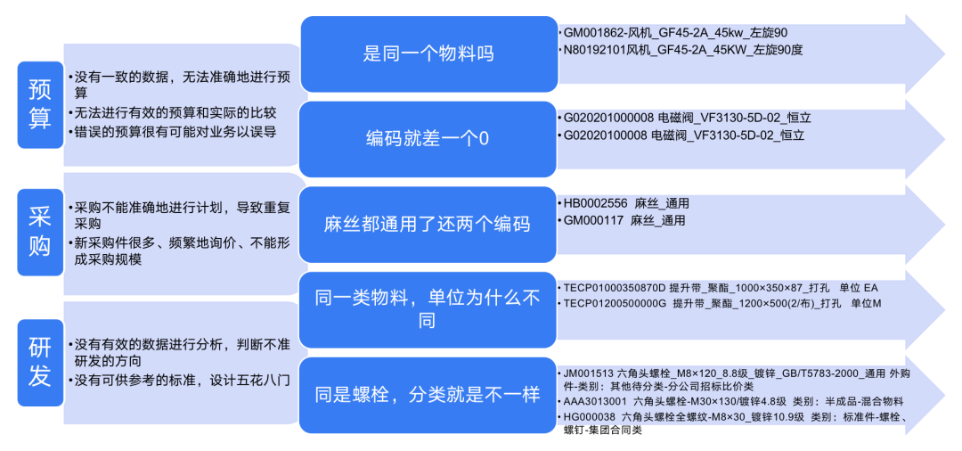 我们可以看到这里少了一个度,并且编码是不一样的,但从这个主体来说,它是 同一个物料,但是却存在两条记录;像第二个也是,它的编码只差了一个0,但编码的却是两个;下面的数据也同样如此,当企业在做物料的预算时,由于找不到到底是那条数据缺失了,所以他没办法做一个准确的预算。对于采购也是如此,当业务系统里存在两条采购数据,这样就会导致一些大量的重复采购,从而浪费资源。因此主数据管理的意义主要表现在以下4个方面: