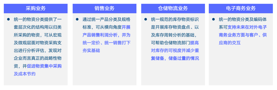在整个供应链的过程中也起到一些作用,比如在采购方面,避免了重构采购节约了成本;在销售方面,由于基于统一的分类和规格标准,在做扣利润分析、产品销售分析时更加准确;在仓储物流方面,因为有统一的高质量的主数据,减少了重复的储备,在管理效率上也能有很大的提升。