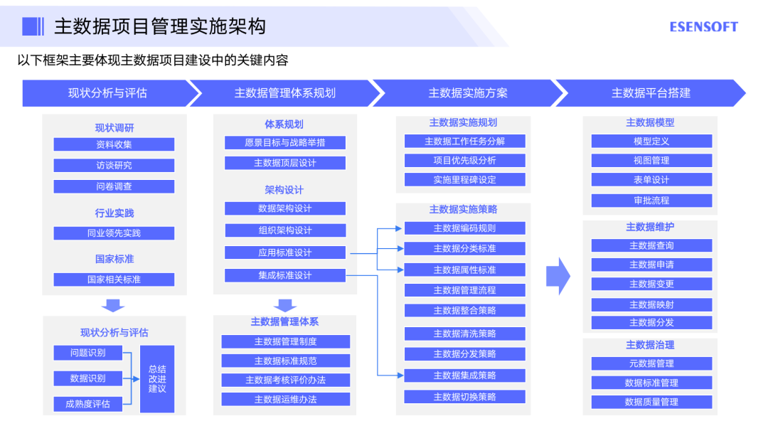 我们这里其实可以看到这样的一个主数据项目管理这样的一个实施的框架。这个框架其实分成4大部分,第一个就是现状分析与评估,第二个就是体系的规划,第三个就是实施方案,最后就是一个平台落地部署的工作。