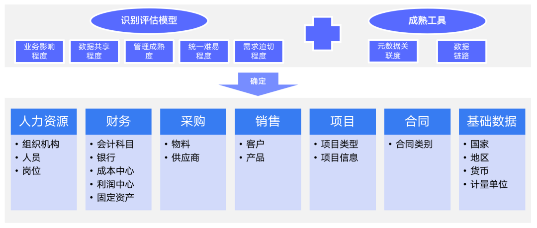 识别项目目标就是要做一个主数据识别,主数据识别可以从两方面去考虑,第一个就是通过一些已知的分析维度,以及业务影响程度等,还有数据共享程度比较高的,或者说数据需求比较迫切的,我们都可以将其纳入主数据范围。除此以外,还可以通过一些成熟的工具做一些分析,通过这样的工具去对接业务系统,从而识别企业到底有哪些主数据,然后这些数据分布在哪里。