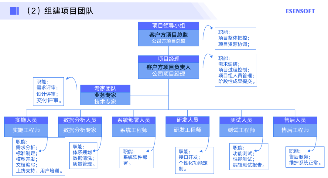 第二个就是组建项目团队,如图所示,项目管理也是这样去组建团队的,比如项目领导小组有项目总监、项目经理,还有一些各种不同的角色的实施人员,除此以外,还配备一些专家的团队做支持。
