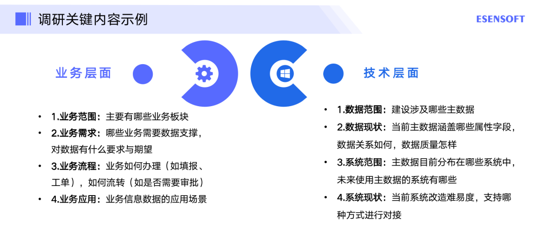 这一阶段做的事情就是前期的需求调研,主要目的是获取企业主数据的管理现状,以及存在哪些问题。这个过程中,我们也会搜集这个行业比较好的实践案例,以及国家是否有出台相关的标准,这些都能方便去了进行现状分析与评估。