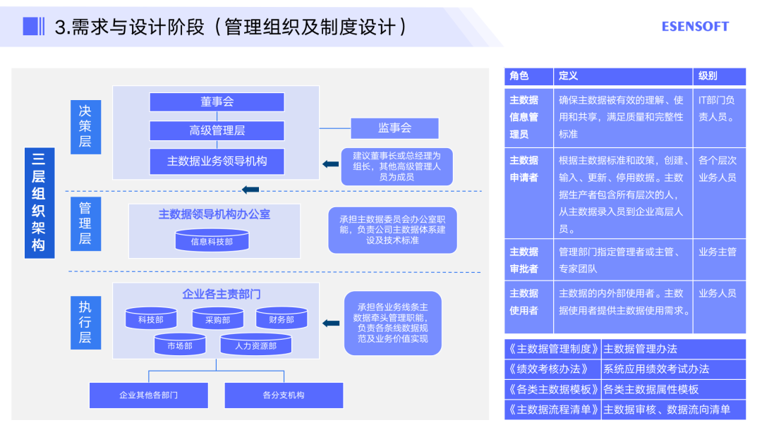 除了需求调研,还有一个重要的板块是管理制度设计,这里采取三层的架构——决策层、管理层、执行层。