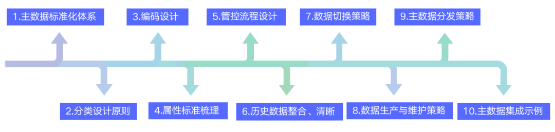在具体的实现阶段有10项工作要去做,这些工作可以并行考虑,包括数据标准化,分类编码属性管控、流程整合以及切换策略等等,下面我们具体来看看。
