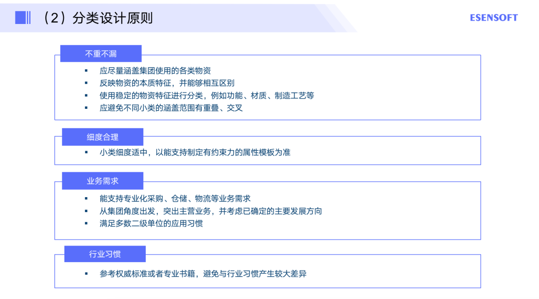 更多是做一些主数据的管理,比如我们需要确定这一期项目到底做哪些,分类是什么,比如物料主数据的分类,与此同时还有主数据的编码是怎样的,有什么标准,然后还有一些类似于“我的”这样的属性到底有哪些。