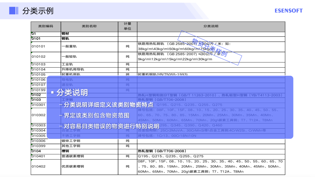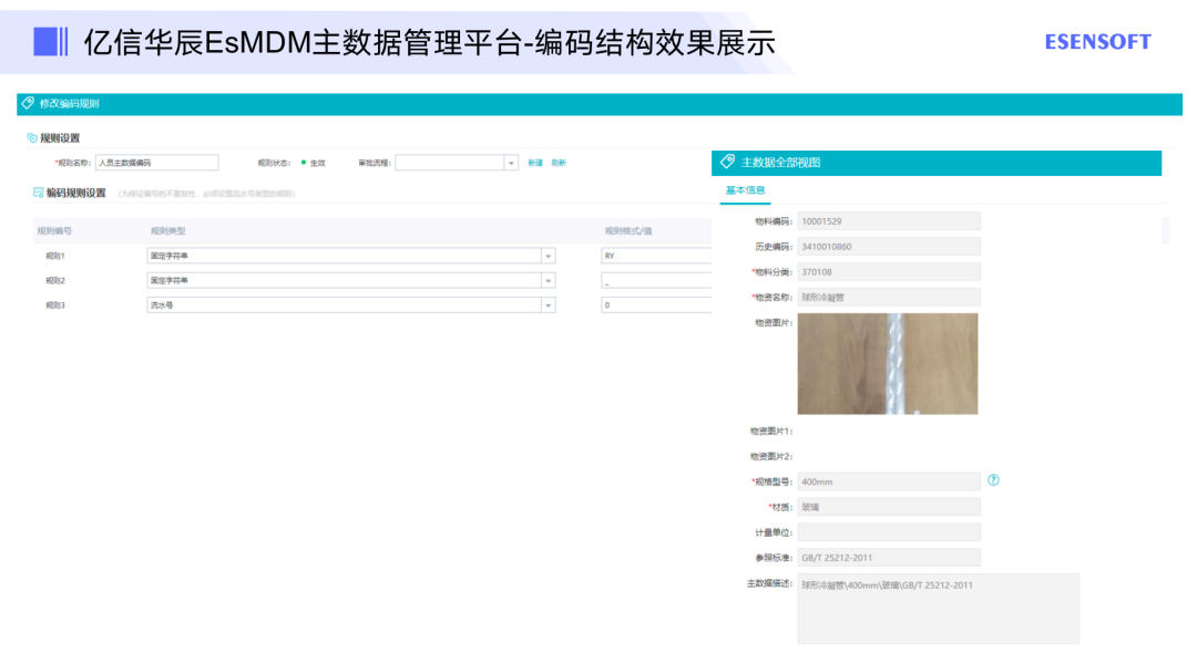 主要是将前面所有梳理好的属性与分类,以及历史主数据治理好后,搭建一个平台去做呈现。以一个物资示例来说,通过主数据的管理,实现了业务上的集中管理,比如,统一的物资分类及编码体系可提供一套“共同语言”,促进企业在供应链业务各方面的集中管控,并作出以事实为基础的决策。