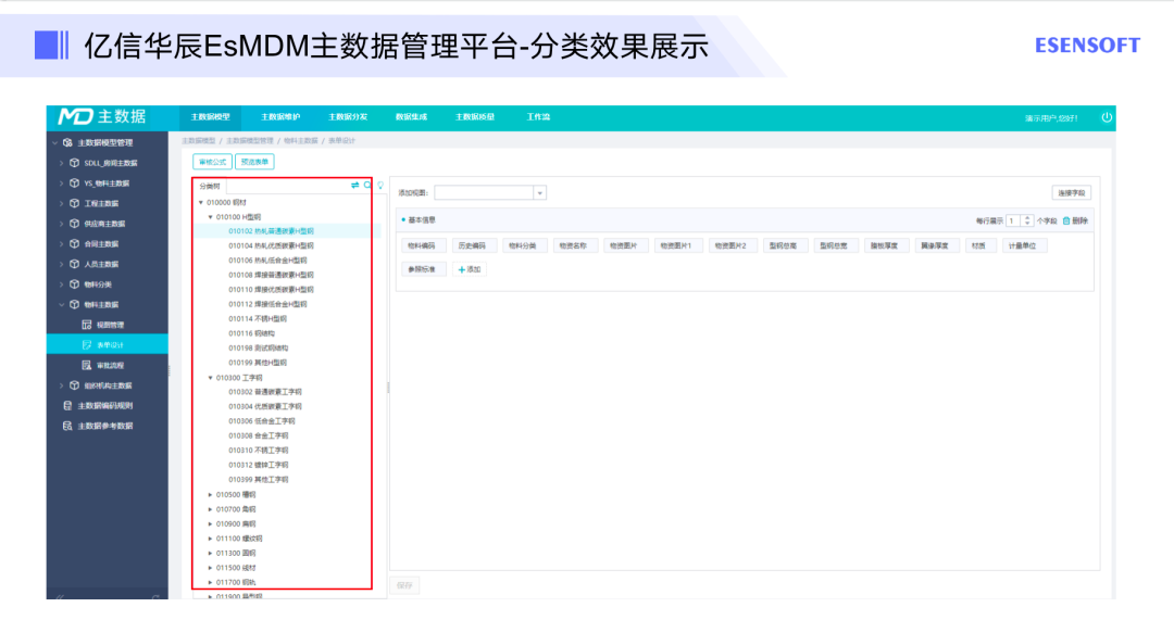 当然,我们亿信华辰的主数据管理平台也是可以做分类的效果展示,如图所示,可以将我们前面做好的分类,直接在平台上进行维护,这样我们就可以很方便的去做一些分类管理,以及每一种分类对应哪些物料数据。