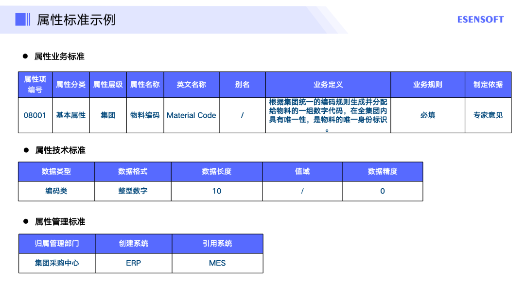 在进行主数据属性标准梳理时,我们可以从业务标准、技术标准、管理标准三个层面来进行。比如业务层面,我们需要理解属性到底属于哪一个分类,属性名称是什么,有怎样的业务规则;技术层面,我们可以定义属性,以及类型长度精度等;管理层面我们可以梳理谁来创建,谁来使用,谁在维度等,提前将其确定出来,方便后续制定这样的制度,如图所示是一个属性标准的示例。