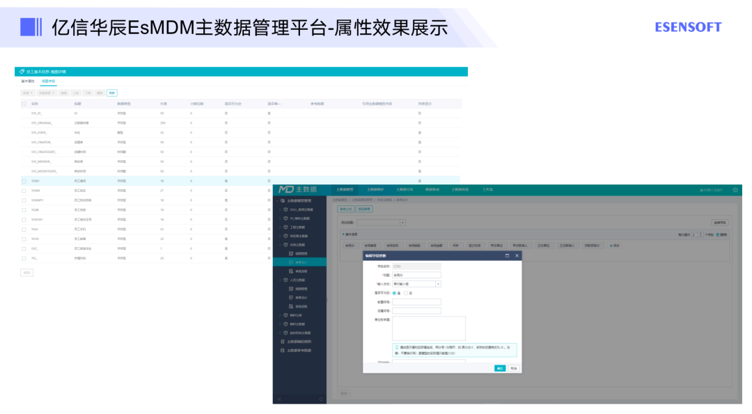 在亿信华辰的主数据管理平台上,我们可以进行属性标准的梳理,如图所示,员工编码梳理完之后,落地到平台上,它的名称标题以及中文名称是怎样的,是什么类型数据,这些都可以通过平台进行梳理,然后再在前端设置一些填报的效果等等。