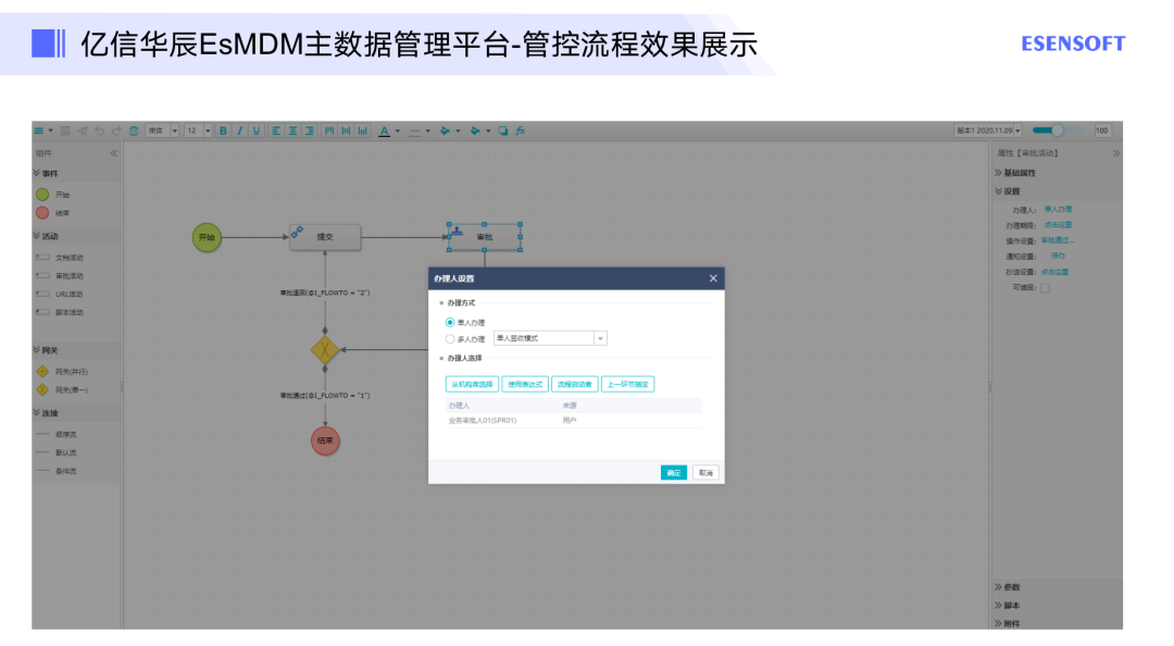 这里亿信华辰主数据管理平台能提供这样的审批方式,可以通过工作流平台去绑定工作流,去做一些流程设计,或者与企业里一些成熟的流程系统做对接,然后通过企业的系统进行流程上的管控。除此以外,还可以在亿信华辰的主数据管理平台绘制流程,指定相应的审批人员,办理人员以及设置办理期限等,最终起到规范数据的作用。