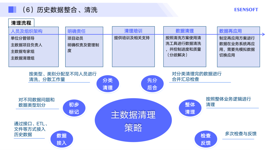 这一阶段主要是对每一项做分解,比如编码规则是什么,有怎样的分类。它有哪些属性,以及在这个过程中,还涉及历史主数据的整合,还有清洗、分发、集成的策略等等。最后还有主数据在使用过程中,如何做更好,如何慢慢地切换到一个统一的平台上,这些都是实施方案所需要关注的。