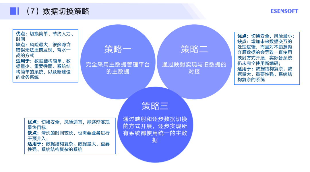 这里提供三种切换的策略,第一种是完全采用主数据管理平台;第二种是通过映射实现与旧数据的对接;第三种是通过映射和逐步数据切换的方式开展,逐步实现所有系统都使用统一的主数据,具体的优缺点和适用场景如图所示。