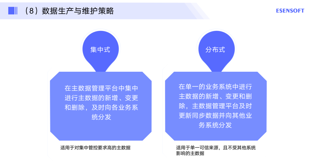 在数据生产和维护方面有两种策略,一种是集中式,即所有的数据新增、变更、删除以及管理全过程都在主数据管理平台上来进行,统一的管理,统一的分发;另一种是分布式,即通过在某个单一的业务系统里去对某一类的主数据,进而做新增、变更与删除,然后主数据平台及时去同步业务系统的数据,并向企业业务系统去做分发,这时的主数据平台就起到一个中间桥梁的作用。
