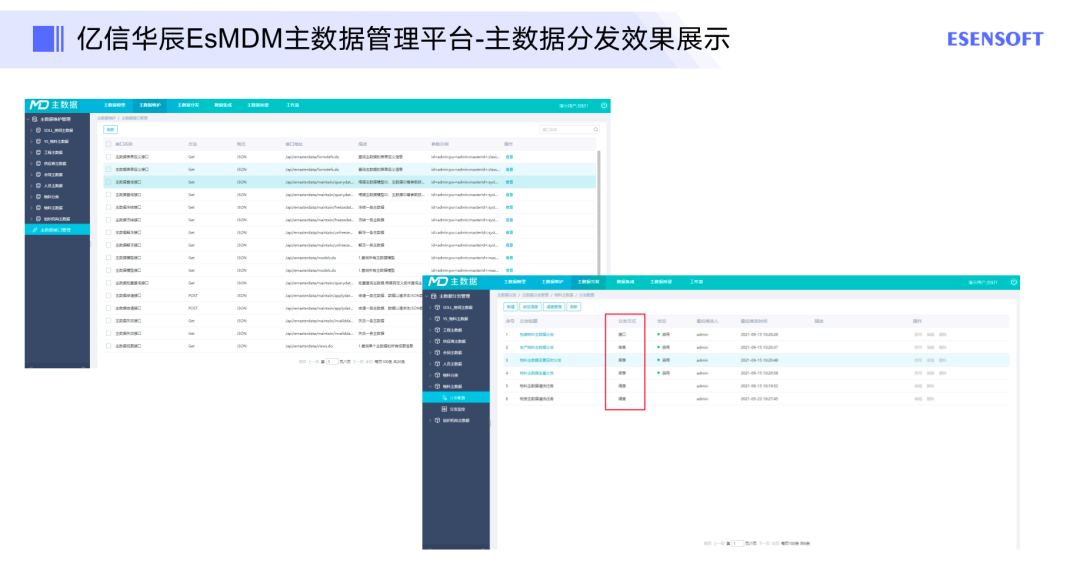 第三种是通过文件分发,即通过离线文件的方式分发数据,适用于系统繁忙情况下的批量分发。如图为亿信华辰的主数据管理平台的分发效果,提供了大量的接口,还支持自定义接口,以及多个表关联后的数据再做分发等,都能借助平台实现,除此以外,我们还有分发的配置,支持接口库表,同时还有一些数据集成的工具,可以设置一些任务,以任务的方式来做分发。