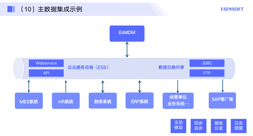 这里是一个主数据集成的示例,就是主数据管理平台还可以通过工具与各个业务系统去做对接集成,包括主动的方式去推数据,也包括被动的方式去拉数据,至于怎么去做,同步或者异步都可以,还可以做日志的预警。