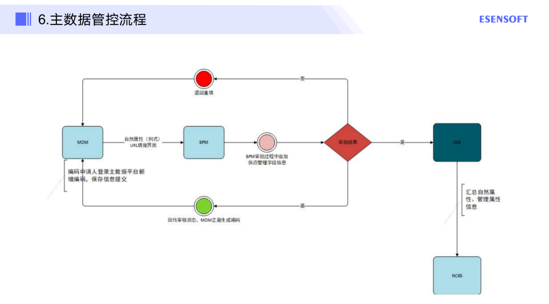 如图是该集团的主数据管控流程,也是通过我们亿信华辰主数据管理平台去填写数据,由BPM系统做审批,最后再通过ESB发送到不同的业务系统中去。