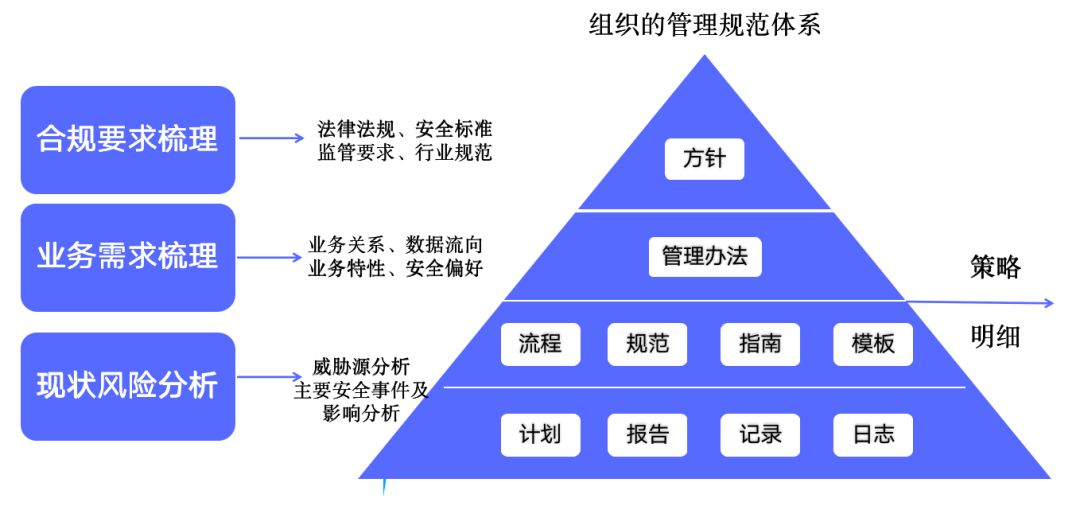 数据安全保障体系的规范一般从业务数据安全需求、数据安全风险控制需要及法律法规合规性要求等几个方面进行梳理,最终确定数据安全防护的目标、管理策略及具体的标准、规范、程序等。
