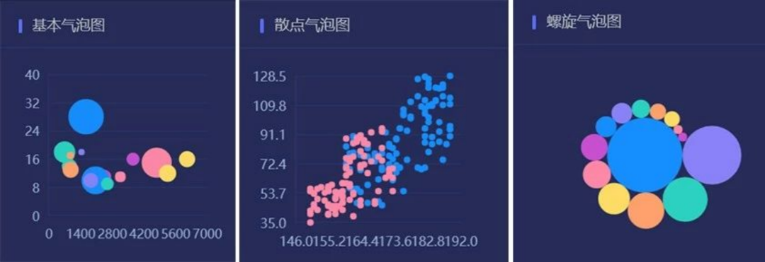 气泡图,是通过气泡的面积大小来对比数据的图形方式,它除了可以反映散点图中坐标点X、Y的相关关系,还有一个维度的数据可以映射到气泡的面积大小上,因此「气泡图」可以在二维平面展示三维信息的数据。