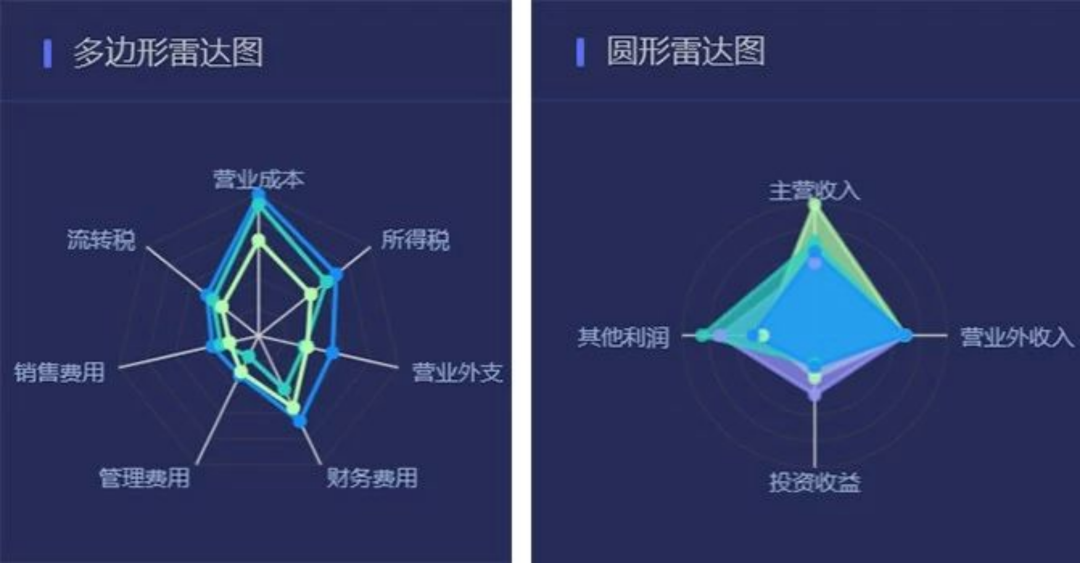 (1)应用场景:雷达图用以显示独立的数据系列之间,以及某个特定的系列与其他系列的整体之间的关系,必须拥有相同的指标。