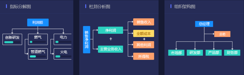 (2)评价:多用于框架图,逻辑关系比较明确,但没有数据数值的对比。