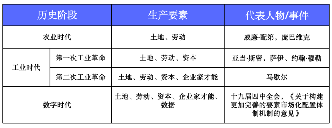 生产要素是一个历史范畴,随着经济社会的发展而不断演进。在不同的经济形态下,它有着不同的构成和不同的作用机理。新生产要素的形成,会驱动人类社会迈向更高发展阶段。如图所示,不同历史阶段的生产要素不同:
