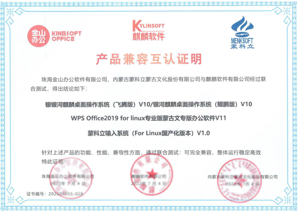 为更好地履约核心厂商的服务义务,随着软件的迭代更新,麒麟软件再次携手珠海金山办公软件有限公司(简称“金山办公”)、内蒙古蒙科立蒙古文化股份有限公司(简称“蒙科立”)就WPS产品、蒙科立输入法及字库与银河麒麟桌面操作系统联合互认证事宜达成共识,三方共同制定测试标准及测试用例,经过金山办公与麒麟软件共同测试,得出以下结论:WPS Office2019 for linux专业版蒙古文专版办公软件V11、蒙科立输入系统(For Linux国产化版本)V1.0与银河麒麟桌面操作系统V10相互兼容,整体系统稳定,产品体验良好,不断满足国产化Office的特殊需求。
