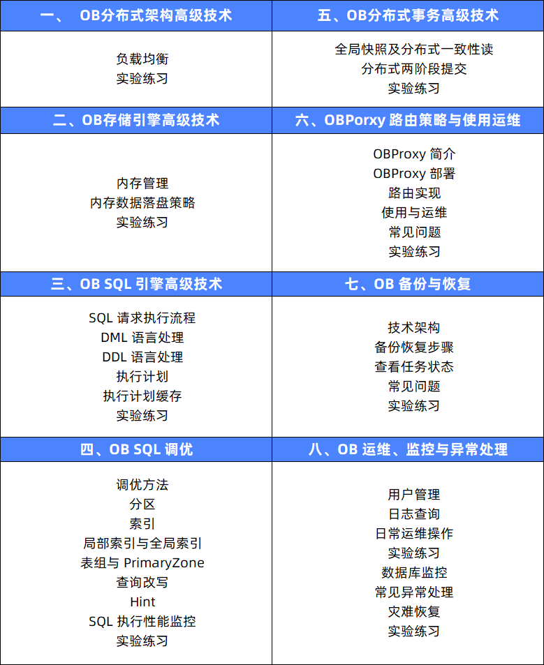 OBCP 主要讲解 OceanBase 的高级特性(全局索引、全局数据一致性、负载均衡策略、SQL 引擎优化),以及 OceanBase 内存构成、内存数据落盘策略和 HTAP 等知识,同时提供了进阶实验课程。