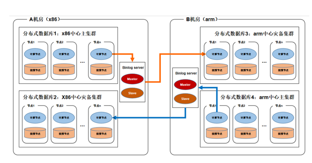 在A机房(x86)和B机房(arm)的双平面环境里分别部署2套GreatDB集群,分别为x86中心主集群、x86中心灾备集群和arm中心主集群、arm中心灾备集群。此外,AB机房分别配置2个binlog server,负责实现各自机房内集群的数据同步。