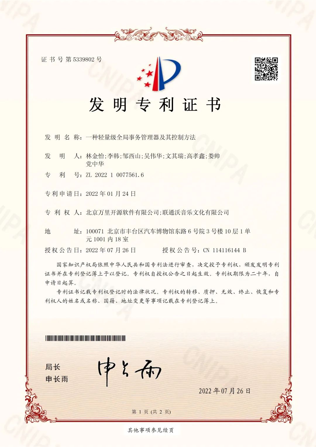 此次专利由万里数据库联合联通沃音乐的技术专家通过数月的技术研究共同取得,也是万里数据库与联通沃音乐又一次深度合作的里程碑。