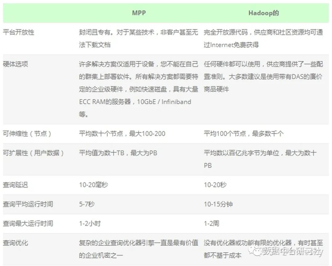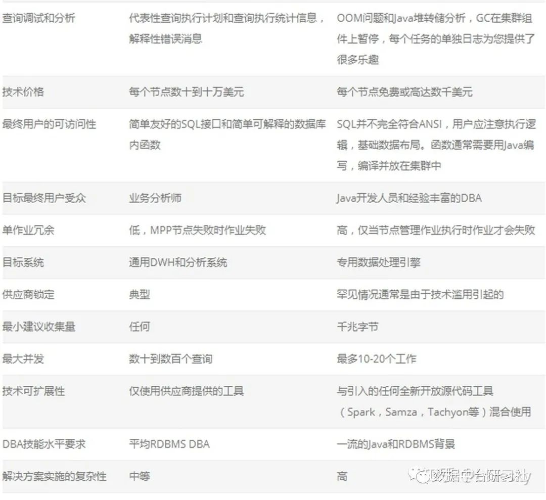 因此,新人提出的关于“我应该选择MPP解决方案还是基于Hadoop的解决方案?”的问题变得非常流行。许多供应商都将Hadoop定位为传统数据仓库的替代品,这意味着这是MPP解决方案的替代品。当Hadoop和MPP彼此分开并集成到一个解决方案中时,其中一些在消息传递和推进Data Lake Data Hub概念方面更为保守。