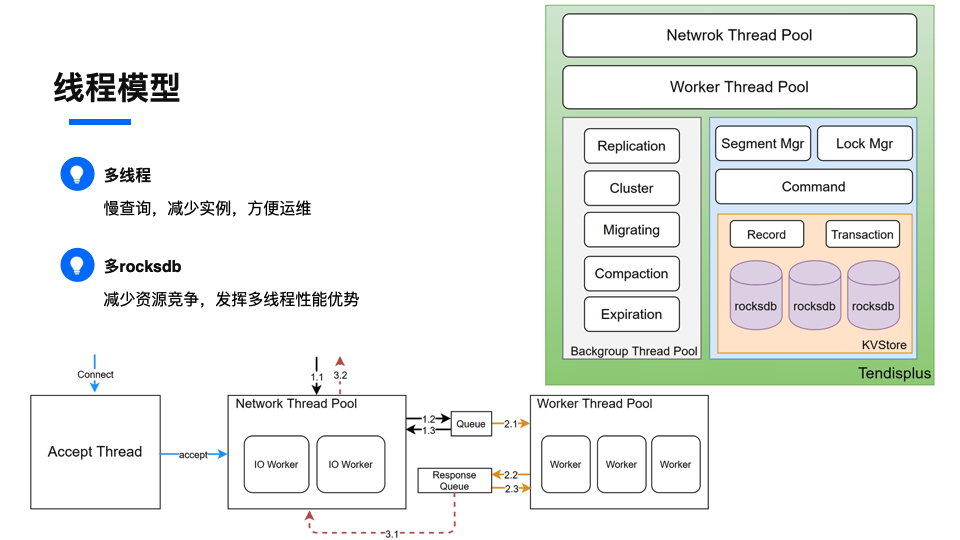我们线程模型主要分为网络io线程,命令处理线程,分片模块,锁模块,命令处理模块,底层rocksdb引擎。主从复制线程,cluster集群管理模块,搬迁模块,底层compaction线程,过期线程。我们的命令处理是多线程的,主要的目的是发挥多线程的性能优势,同时解决单线程模型下,慢查询卡住所有请求的问题。这样也可以减少实例,方便运维,同时,相比单线程的多实例部署,单个节点存储的数据更多,对gossip也有好处。Rocksdb我们采用多实例:这样可以减少资源竞争,充分发挥存储引擎的性能优势。这样我们的key就需要按hash模以store的个数。