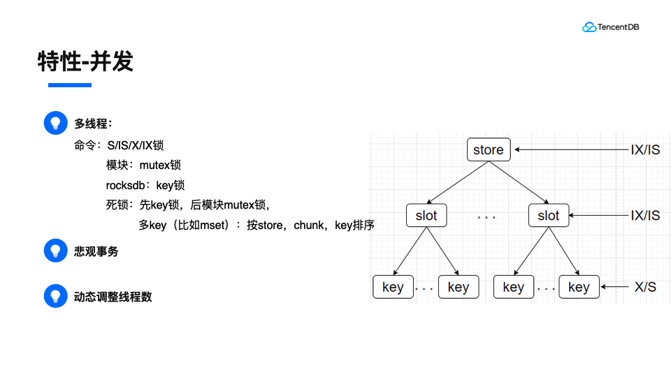 因为我们采用了多线程,而rocksdb内部的锁是kv级别的,如果两个线程同时操作一个redis层的key,会有并发问题。所以这里引入了数据库锁。同样,在server层一些模块的资源需要加上mutex锁。另外rocksdb内部会有key级锁。这里有一个死锁的问题要特别小心。这里的解决方法是,对于一个命令,要先上SX锁,再上模块锁,对于多key来说,需要排序,排序的时候,先按store排序,再按chunk排序,最后按key排序。通过固定排序的规则,来保证这些资源上锁的顺序相同,从而避免死锁的产生。因为我们引入了SX锁,所以在rocksdb层锁冲突基本是不存在的,所以我们可以直接采用悲观事务,这样写代码就不需要retry,会简化相关逻辑。另外,我们增加了动态调整线程数的功能,这样可以在线上环境进行方便的调整,来达到最高的性能。