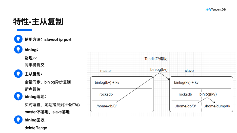 这里我们采用binlog进行同步,里面存储的是物理kv。我们没有采用逻辑命令同步,主要是为了使得实现更简单,不需要对不确定性命令进行特殊处理。同时我们把binlog跟普通kv在rocksdb的同一个事务里面提交,这样的好处是,可以保证binlog与kv的原子性。主从复制一般是先把全量备份先复制给从,然后把增量binlog发送给从,从而实现主从复制功能。如果连接断开,从可以告诉主自己的最新binlogid给主,只要这些binlog都还在db里面,就可以实现断点续传。当然,如果断开时间太长,就需要重新全量同步。Binlog落地,就是将binlog落地到磁盘,然后定期拷贝到冷备中心,主要是用来回档的时候使用。这里为了性能的考虑,master可以不用落地,slave落地。Binlog因为存储在db目录,如果不回收的话,是非常浪费资源的,所以需要定期回收删除。这里的删除没有采用逐个删除的方式,采用了rocksdb的deleterange接口,来提高删除的效率。前期存储的时候,我们的binlog和kv是在同一个cf里面的,这里会有一些性能的问题,所以我们将他们拆开了不同的cf,当然,还是在同一个事务进行提交,因为rocksdb是支持事物跨cf的。简单提一下,这个拆分对性能提升是比较大的,这里具体不展开了。