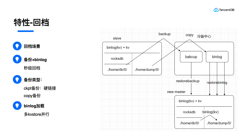为了实现回档功能,我们需要定期生成备份,回档的时候,先加载备份,然后加载binlog,这样就可以实现秒级的定点回档。为了效率,我们生成备份的时候,可以采用ckpt备份,是通过文件硬链接的方式实现的,所以只需要毫秒级别的时间。如果文件系统不支持硬链,可以采用copy备份。其中,Binlog加载的时候,我们可以按照kvstore采用多线程并行,从而提高回档效率。