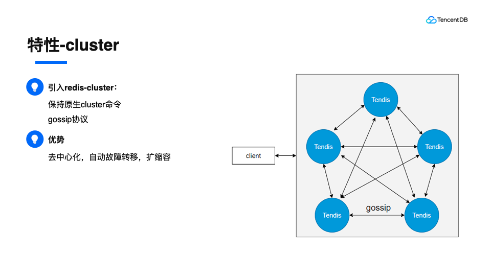 为了方便集群管理,我们引入了cluster能力,并尽量保持原生redis的cluster命令。元数据的同步同样采用gossip协议。这样实现了去中心化,自动故障转移,扩缩容的能力。