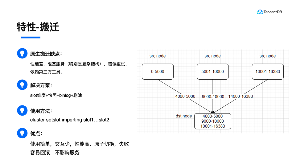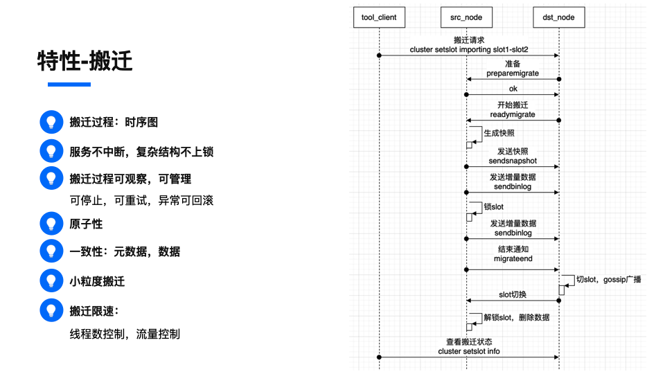 在扩缩容的时候,我们需要对数据进行节点间的搬迁。原生搬迁的逻辑,有一些缺点,主要体现在,性能差,复杂结构阻塞服务,需要错误重试,依赖第三方工具。所以tendis在内核层实现了搬迁方案,以slot为单位,通过发送快照,增量发送binlog的方式实现数据迁移,迁移成功后源节点删除数据。这样带来的好处就是,使用起来很简单,一个命令就可以了。交互少,性能高,slot的归属可以实现原子切换,失败容易回滚,不影响服务,这一系列的好处。
