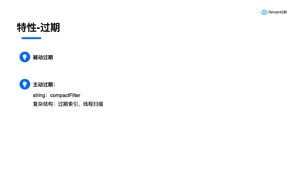 对于过期功能,我们分为被动过期和主动过期。被动过期就是用户访问某个key的时候,如果发现它已经过期了,则立即进行删除操作。主动过期如果是string结构的话,我们通过rcoskdb提供的compactFilter功能进行过期删除。对于复杂结构,因为二级key非常多,而过期信息是存储在一级key上面的,所以无法使用compactfileter来实现。如果进行全量扫描,性能又不允许。所以我们生成了一个过期索引,启动一个线程定期扫描这个索引,发现有过期的,则进行一个删除。