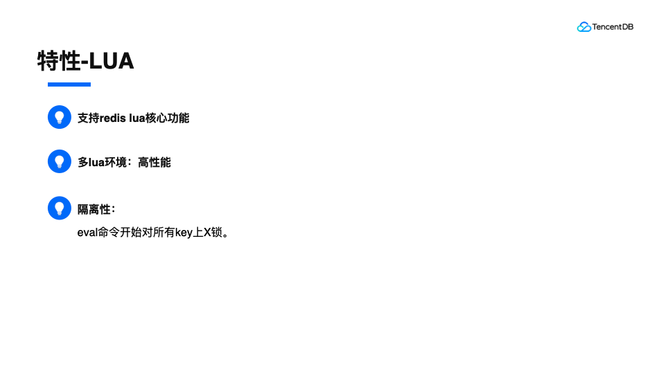 Tendis对lua功能也提供了支持,支持了lua的核心功能。因为我们是多线程,所以我们创建了多个lua的环境lua_state,这样可以发挥多线程的优势,从而实现lua的性能跟普通命令差不多的性能qps。为了保证lua的原子性,我们是在整个eval命令开始的时候,对所有key上一个X锁,从而实现命令的隔离性。