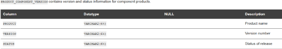 这个视图提供了数据库的标志,并根据数据库版本提供了一些关于核心数据库组件的附加信息,可以在数据库处于NOMOUNT状态时使用。从18c开始,添加了列BANNER_FULL,并包含多行字符串,其中还包括发布更新版本号。