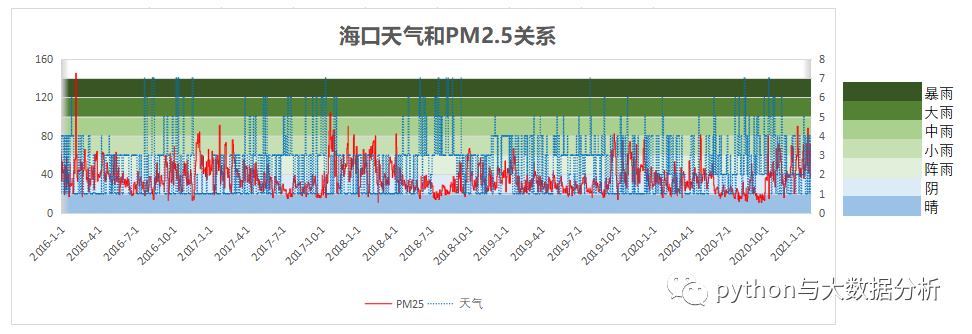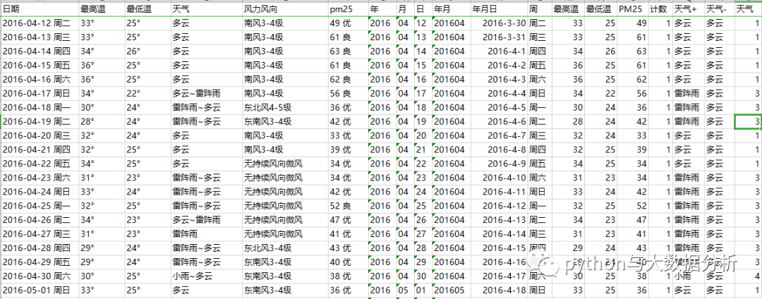 做清洗和转换加了几列,分别为年月日、年月、年月日、周、最高温、最低温、pm2.5,天气又按照特大暴雨、大暴雨、暴雨、大雨、中雨、小雨、雷雨、雷阵雨、阵雨、阴、多云、晴的顺序做了个排序,将天气做了个单一化处理;后来在做图表的时候,发现分的太细,又分为了暴雨、大雨、中雨、小雨、雷雨、阴、晴几个档次。