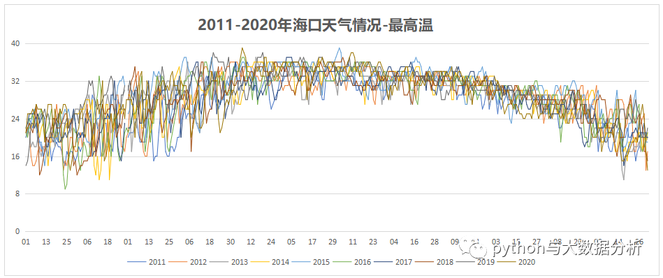 这是按最高温统计的2011年-2021年海口天气情况,各年的数据看起来有点乱,但多少也能发现一些规律,海口的天气热度集中在5-8月份,5、6月份看起来还更热一些,上半年的气温变化更为剧烈一些。